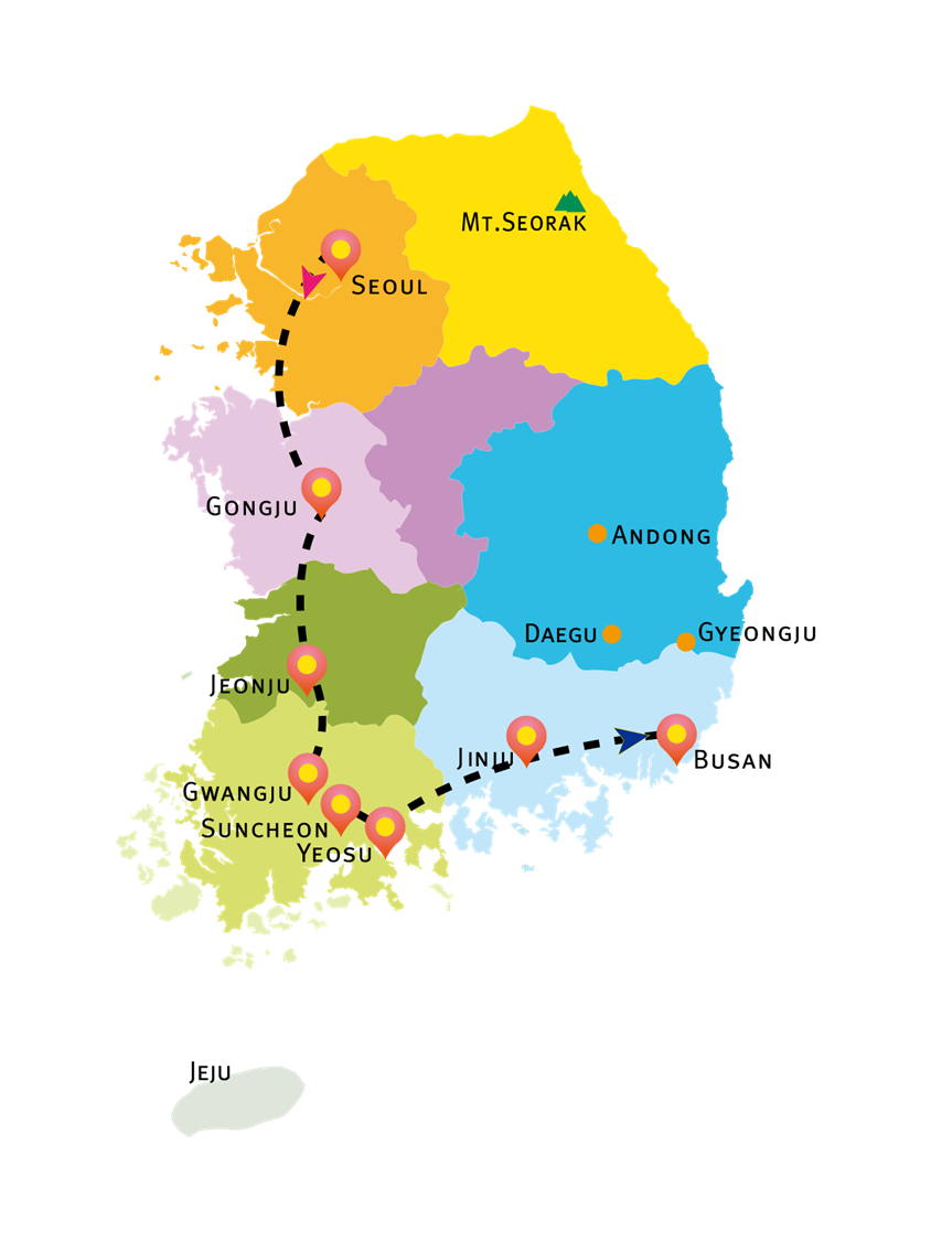 Breakfast at your hotel → Move to Gwangju (100km/ 1hr 30min), the leading city of Honam region and