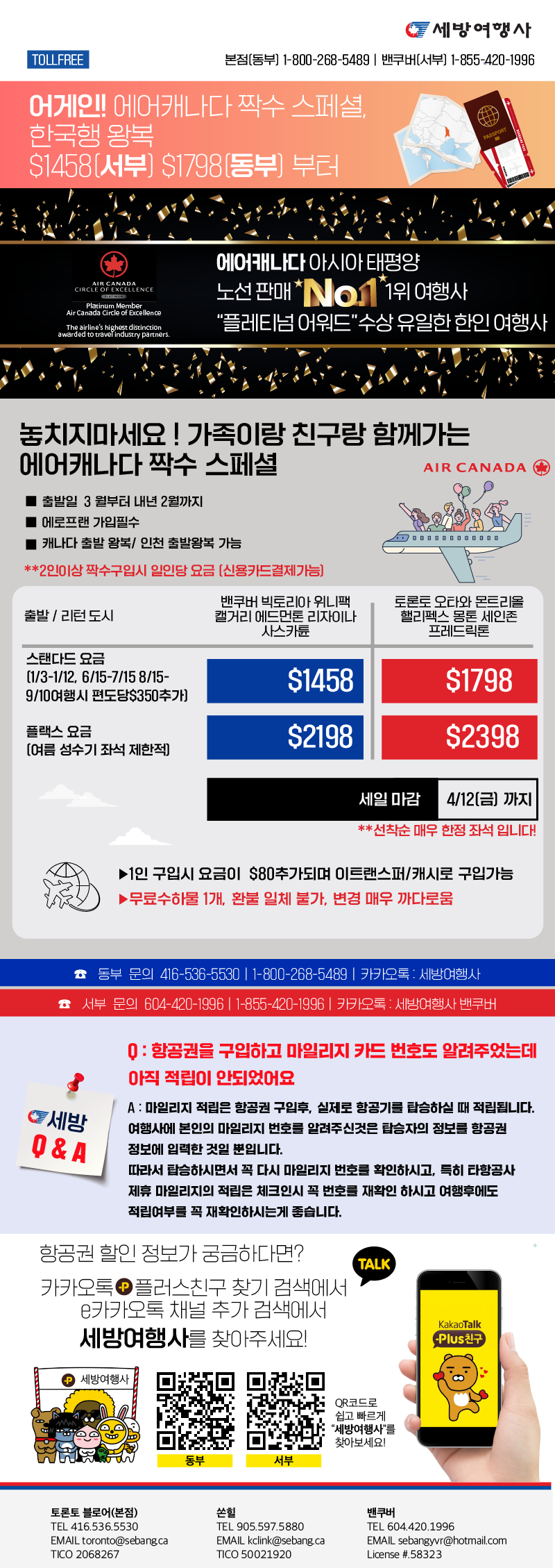 [동서부 뉴스레터] 에로프랜 가입자를 위한, 에어캐나다 현금결제 특가! 서부 $1608 동부 $1998 부터2024/04/252024-04-25 17:22:22