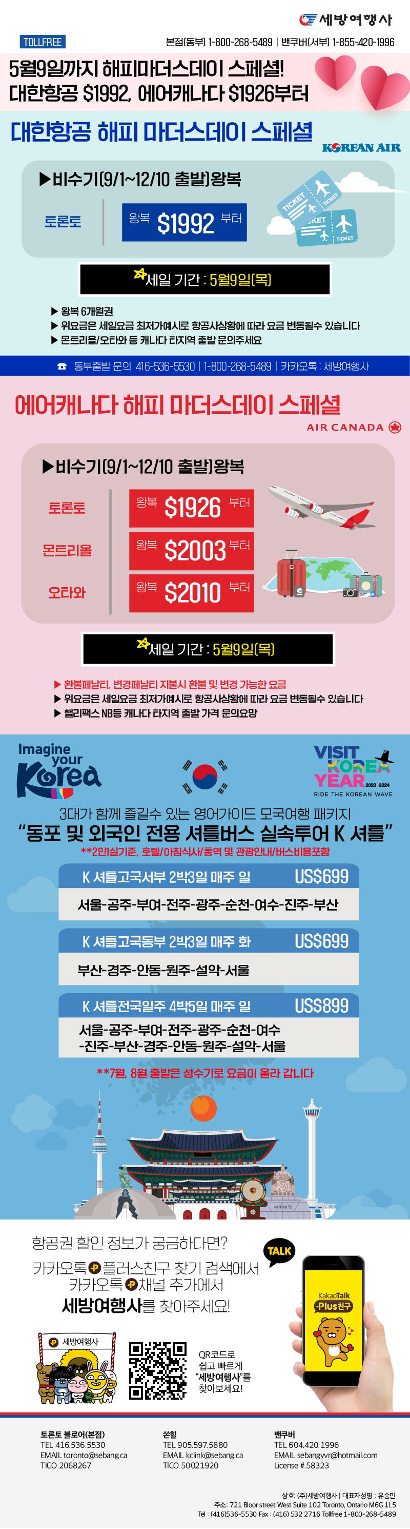 [세방여행레터] 5월9일까지 해피마더스데이 스페셜! 대한항공 $1992, 에어캐나다 $1926부터2024/05/072024-05-07 15:02:02