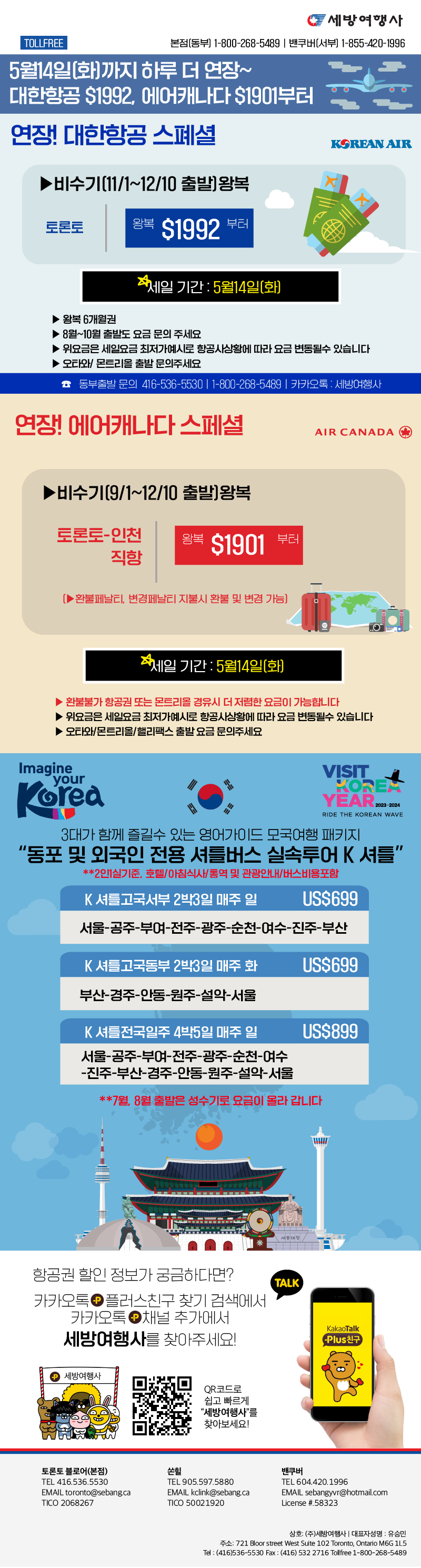 [세방여행레터] 5월14일(화)까지 하루 더 연장~ 대한항공 $1992, 에어캐나다 $1901부터