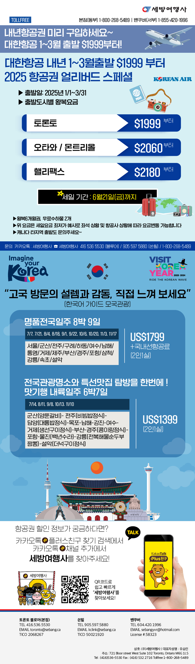 | 대한항공 토론토-인천 2025 출발 항공권 세일! 왕복$2099편도$1250부터 | 2024/08/19 | 2024-08-19 19:59:19 |