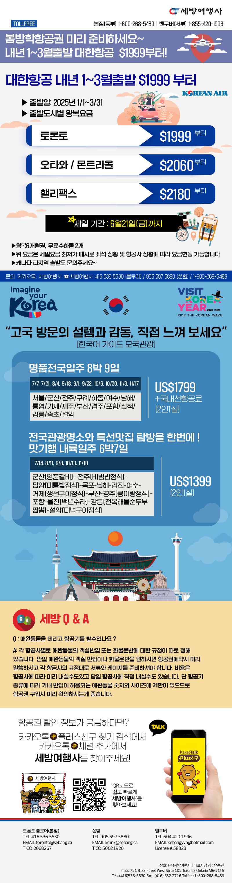 [세방여행레터] 서두르세요! 대한항공/에어캐나다 준성수기 깜짝스페셜! 왕복 $2066부터2024/06/192024-06-19 19:50:42