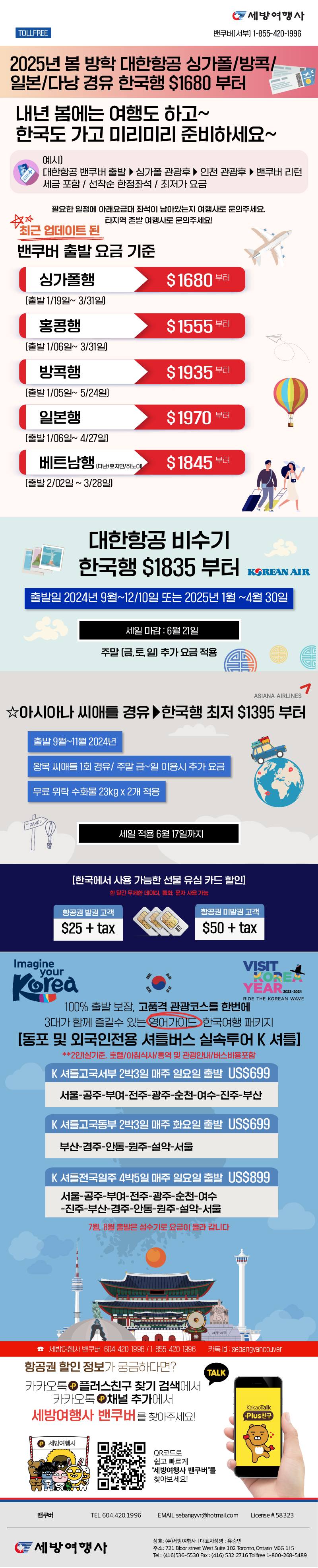 | 대한항공 토론토-인천 2025 출발 항공권 세일! 왕복$2099편도$1250부터 | 2024/08/19 | 2024-08-19 19:59:19 |