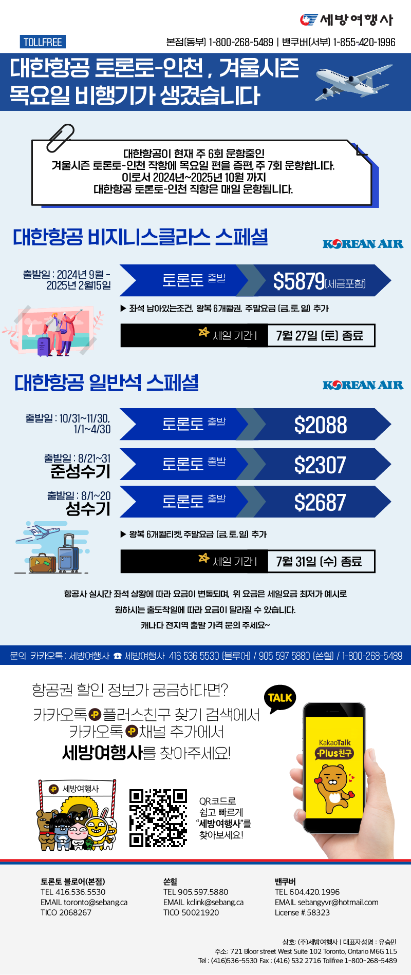 [세방여행레터] 대한항공 2024비수기 깜짝세일 6/17(월)까지 연장, 토론토 $1870 밴쿠버 $1654부터2024/06/142024-06-14 14:45:02