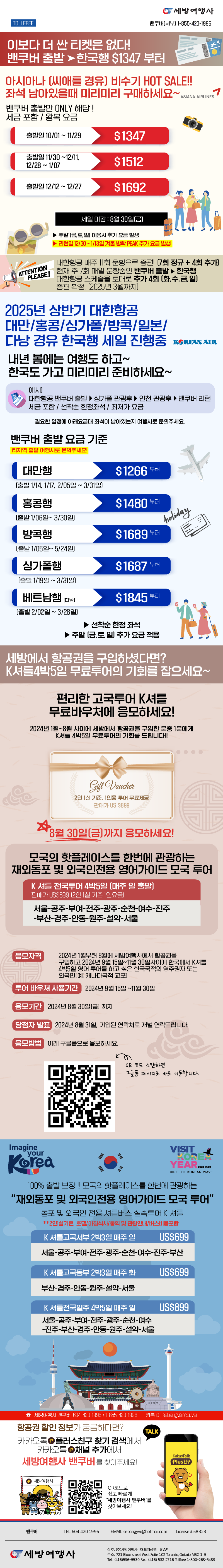 [동부뉴스레터] 여행사만 있는 항공권스페셜, 대한항공 $1807 에어캐나다 $1607 부터 ! 세일은 8월말까지2025/08/272025-08-27 17:12:22