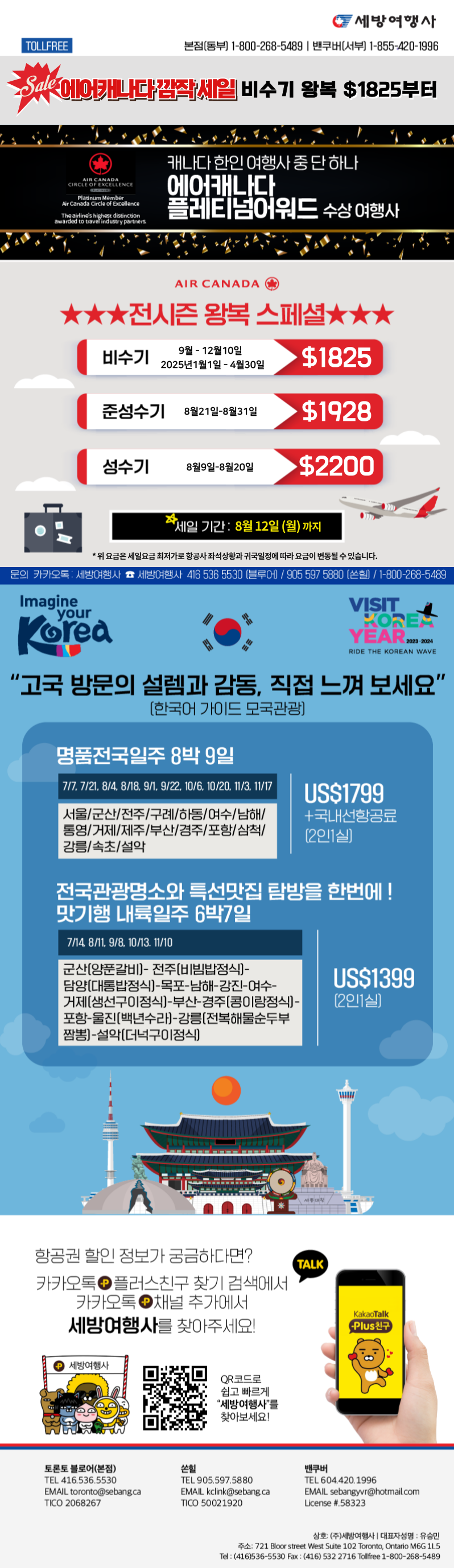 [세방여행레터] 서두르세요!! 온라인 보다 저렴한 에어캐나다 세일은 오늘(9/18 수) 까지2024/09/182024-09-18 19:19:12