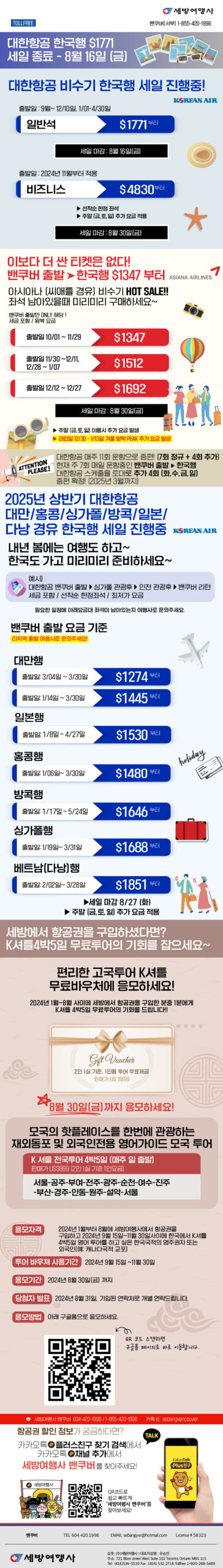 [세방여행레터] 마감임박! 대한항공스페셜 일반석 8/30, 비지니스석 8/31까지! 에어캐나다 파업대비 REBOOKING POLICY 도 확인하세요~2024/08/282024-08-28 19:00:25