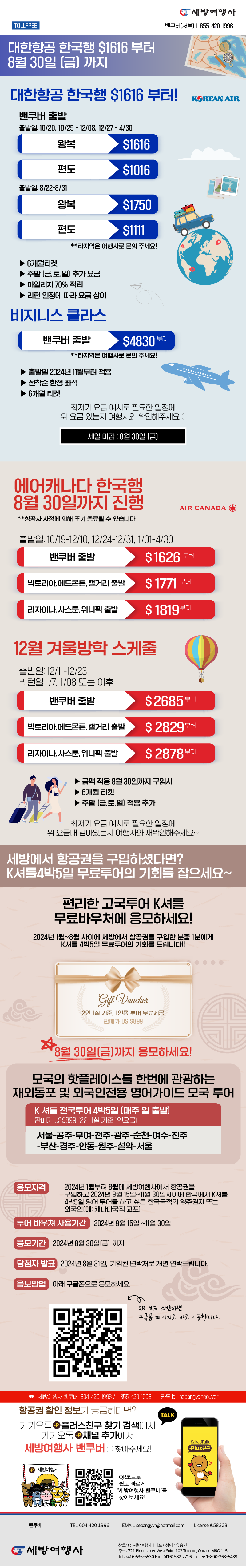 [세방여행레터] 서두르세요! 대한항공/에어캐나다 준성수기 깜짝스페셜! 왕복 $2066부터2024/06/192024-06-19 19:50:42