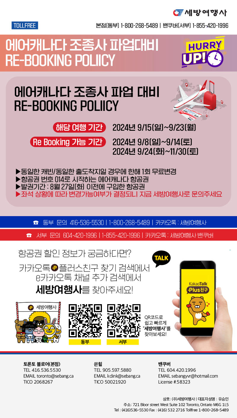 [세방여행레터] 에어캐나다 새 할인 요금 9/18까지, 파업 타결에 따른 RE- BOOKING POLICY 확인하세요2024/09/162024-09-16 19:21:55
