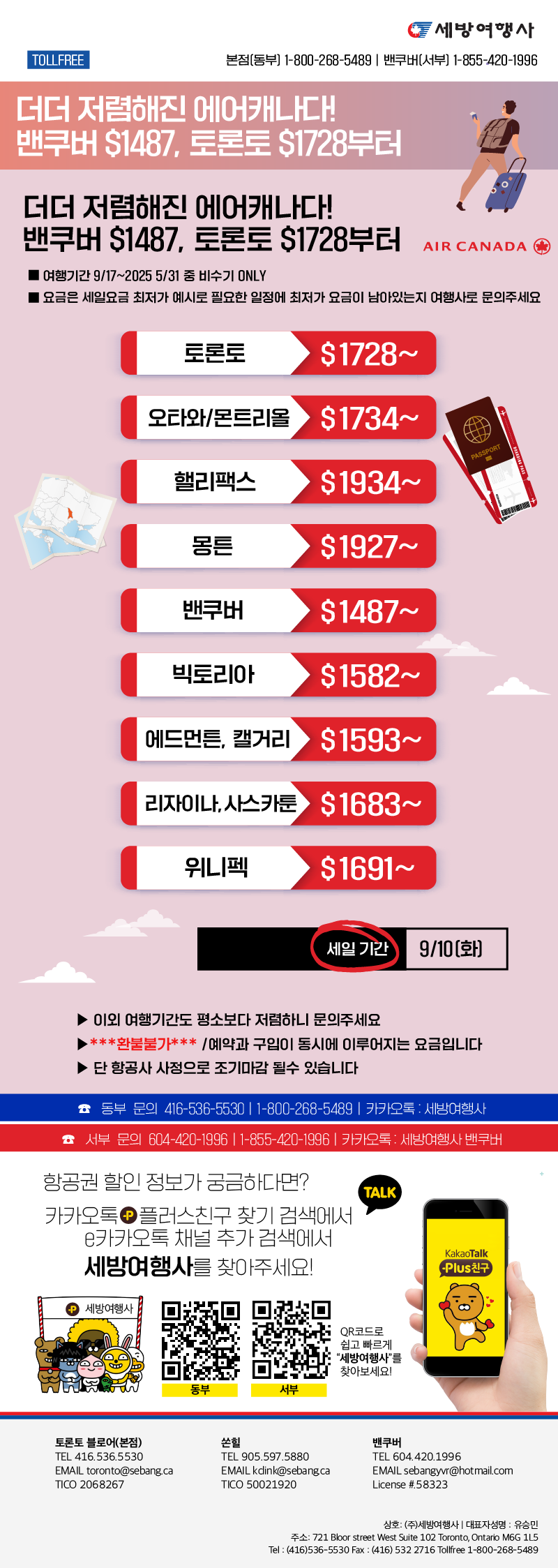 [세방여행레터] 서두르세요!! 온라인 보다 저렴한 에어캐나다 세일은 오늘(9/18 수) 까지2024/09/182024-09-18 19:19:12