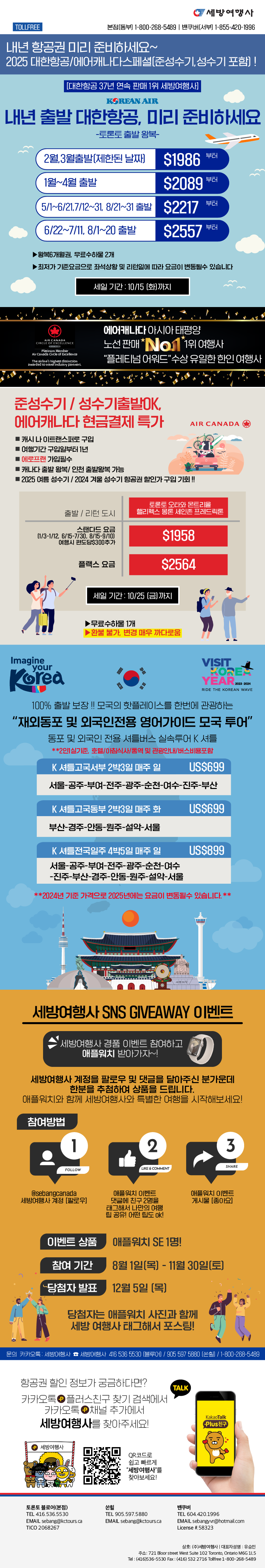 [동부뉴스레터] 에어캐나다 시즌파괴! 출발 60/ 90/120일 전에 구입하는 미리미리특가, 토론토출발왕복 $1334부터2025/02/122025-02-12 18:08:21