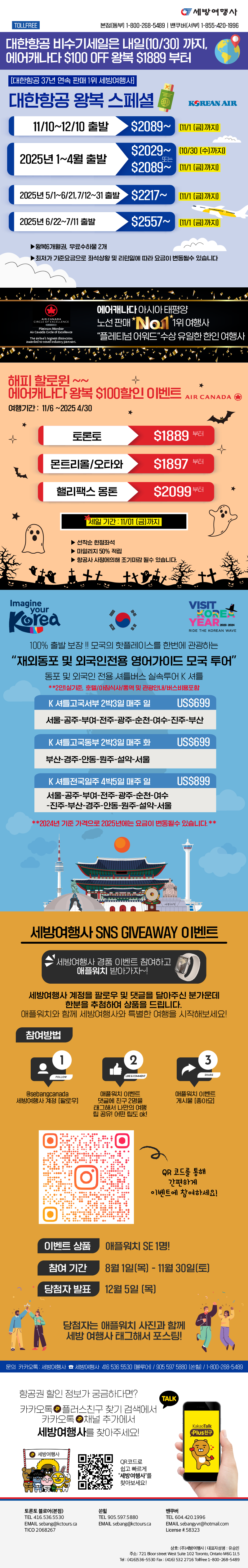 [세방여행레터] 서두르세요! 대한항공/에어캐나다 준성수기 깜짝스페셜! 왕복 $2066부터2024/06/192024-06-19 19:50:42