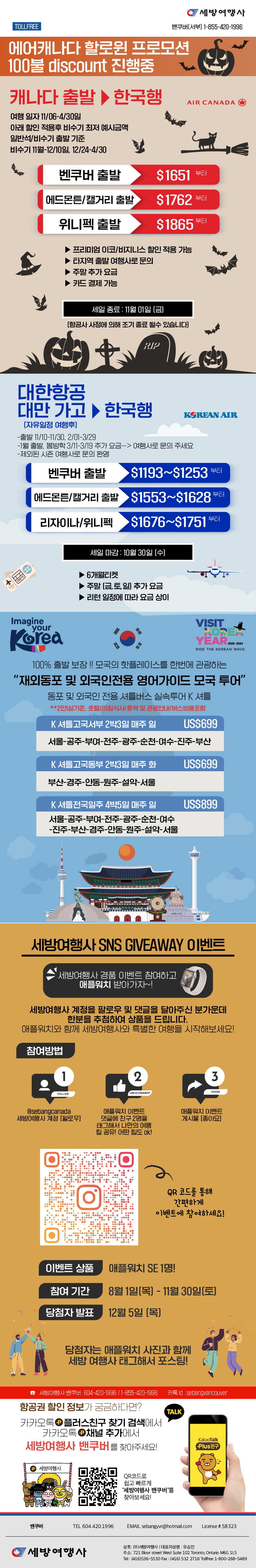 [서부여행레터] 에어캐나다 할로윈 프로모션 100불 discount 진행중2024/10/302024-10-30 13:39:54