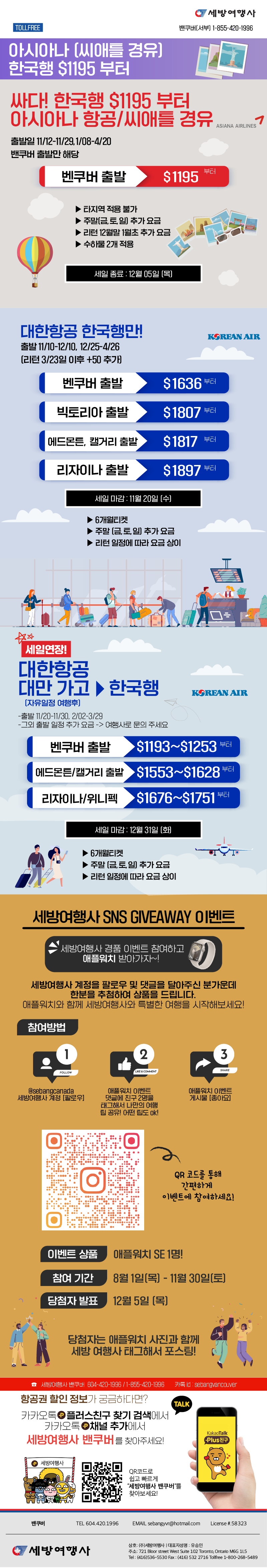 [세방여행레터] 서두르세요!! 온라인 보다 저렴한 에어캐나다 세일은 오늘(9/18 수) 까지2024/09/182024-09-18 19:19:12