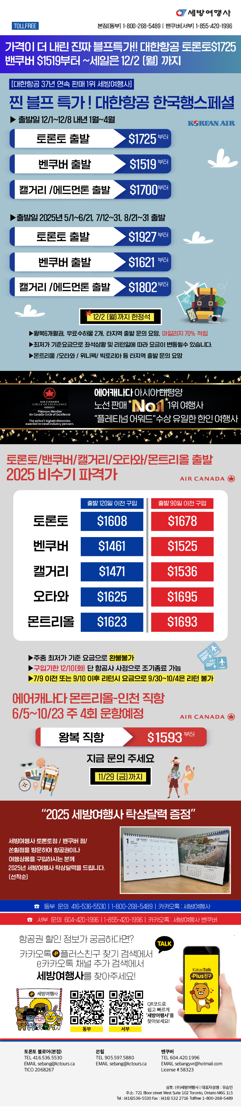 [동부뉴스레터] 에어캐나다 시즌파괴! 출발 60/ 90/120일 전에 구입하는 미리미리특가, 토론토출발왕복 $1334부터2025/02/122025-02-12 18:08:21