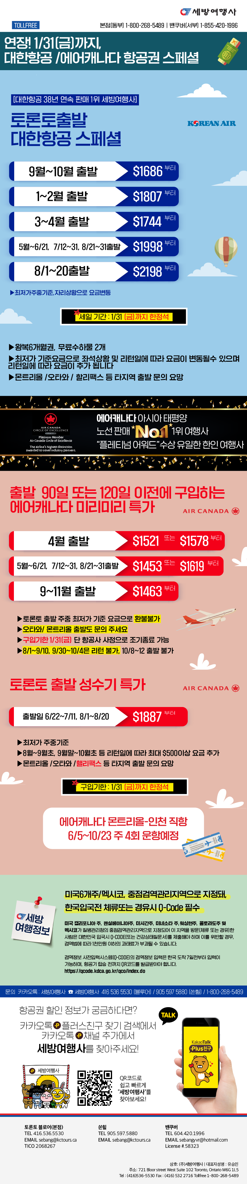 [동부뉴스레터] 에어캐나다 시즌파괴! 출발 60/ 90/120일 전에 구입하는 미리미리특가, 토론토출발왕복 $1334부터2025/02/122025-02-12 18:08:21