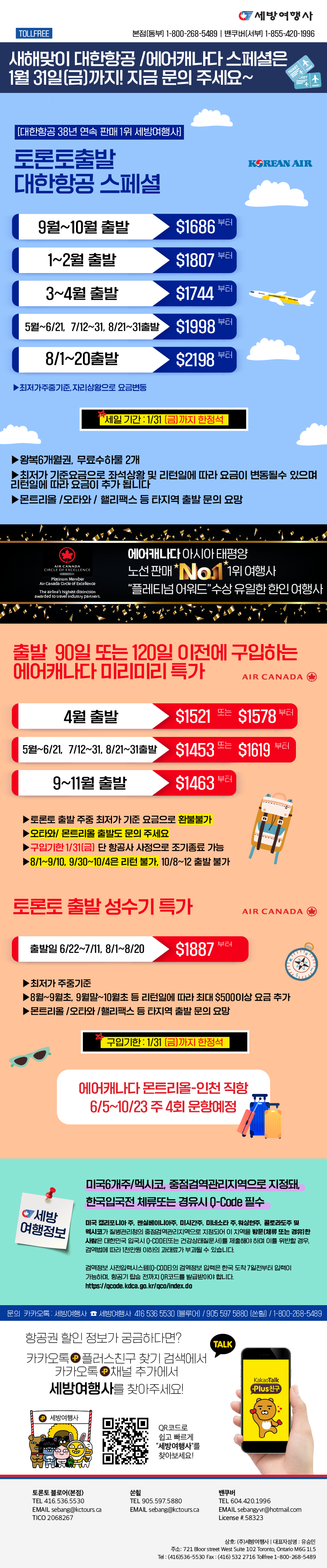 [동부뉴스레터] 새해맞이 대한항공 /에어캐나다 스페셜은 1월 31일(금)까지! 지금문의 주세요~