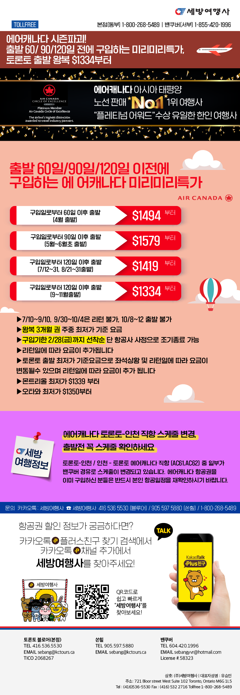 [동부뉴스레터] 에어캐나다 시즌파괴! 출발 60/ 90/120일 전에 구입하는 미리미리특가, 토론토출발왕복 $1334부터2025/02/122025-02-12 18:08:21