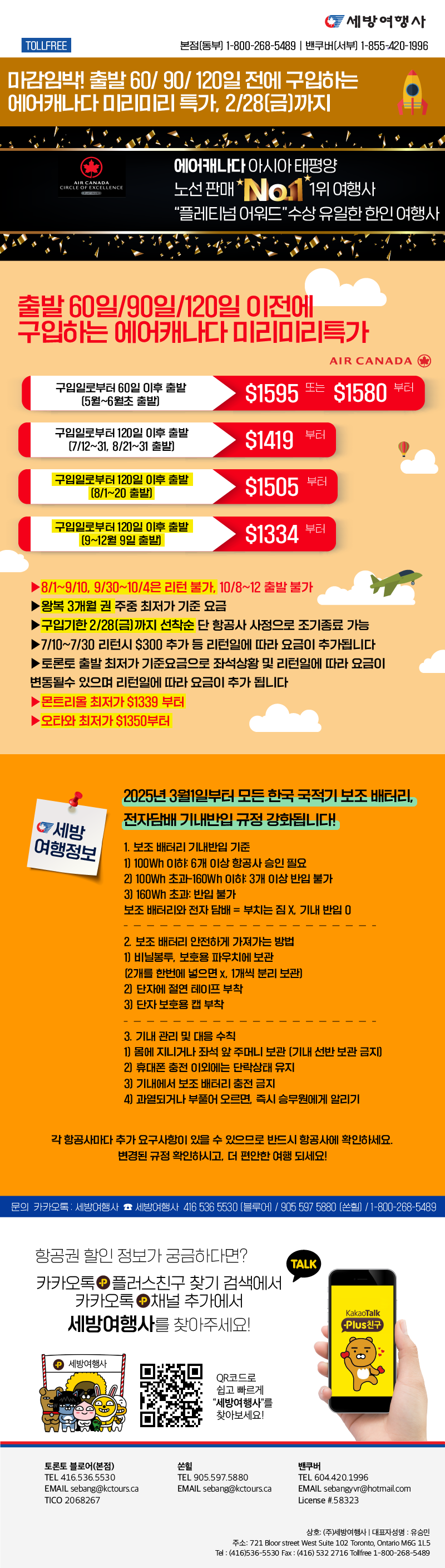 [동부뉴스레터] 에어캐나다 시즌파괴! 출발 60/ 90/120일 전에 구입하는 미리미리특가, 토론토출발왕복 $1334부터2025/02/122025-02-12 18:08:21