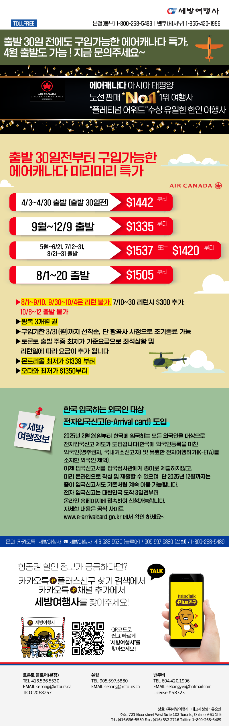 [동부뉴스레터] 에어캐나다 시즌파괴! 출발 60/ 90/120일 전에 구입하는 미리미리특가, 토론토출발왕복 $1334부터2025/02/122025-02-12 18:08:21