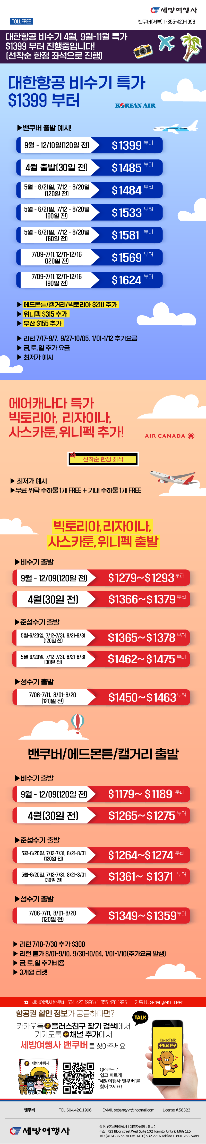 | 에어캐나다 $300 OFF 오늘까지, 대한항공 기종변경 비지니스석 /일반석스페셜 왕복$2023 부터 | 2024/08/23 | 2024-08-23 14:58:15 |