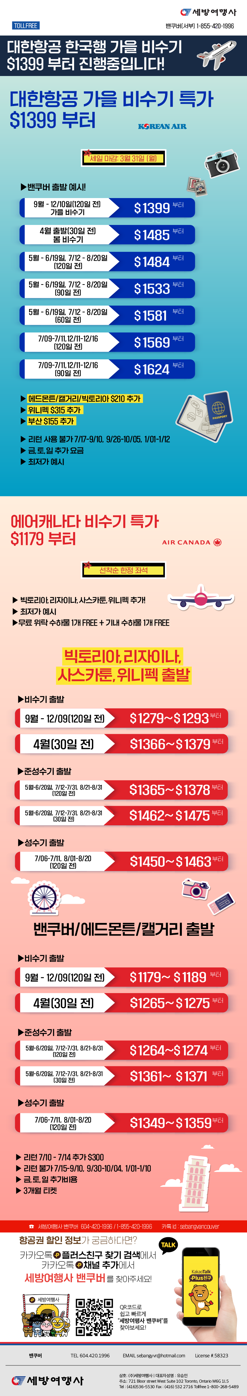 [세방여행레터] 서두르세요!! 온라인 보다 저렴한 에어캐나다 세일은 오늘(9/18 수) 까지2024/09/182024-09-18 19:19:12