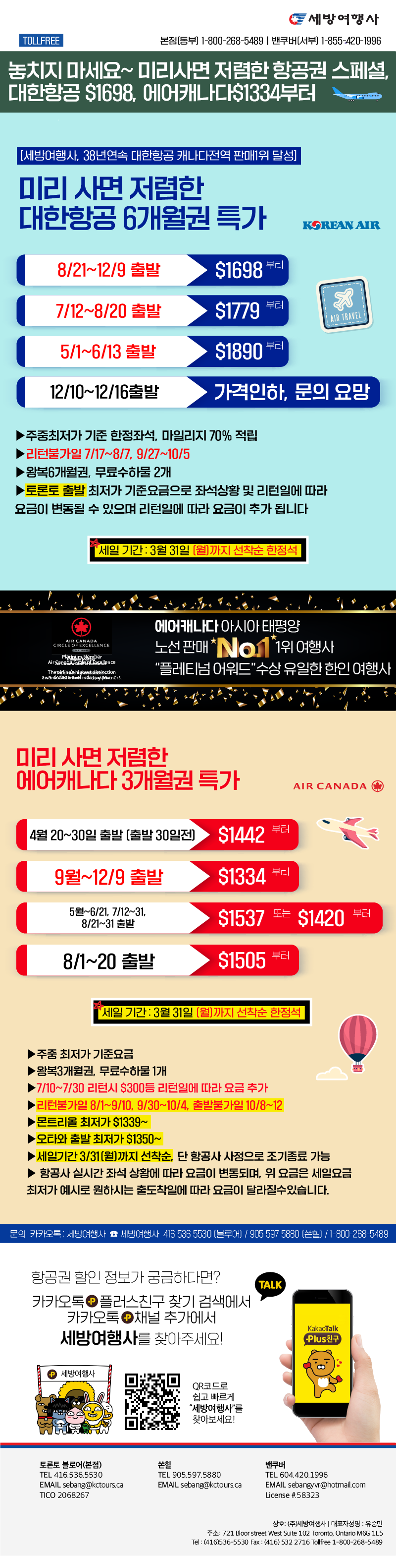 [세방여행레터] 서두르세요! 대한항공/에어캐나다 준성수기 깜짝스페셜! 왕복 $2066부터2024/06/192024-06-19 19:50:42