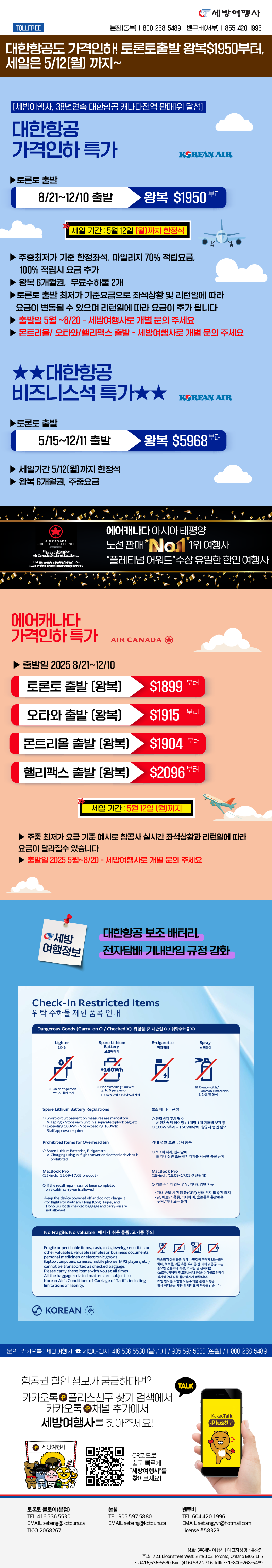 [동부뉴스레터] 여행사만 있는 항공권스페셜, 대한항공 $1807 에어캐나다 $1607 부터 ! 세일은 8월말까지2025/08/272025-08-27 17:12:22