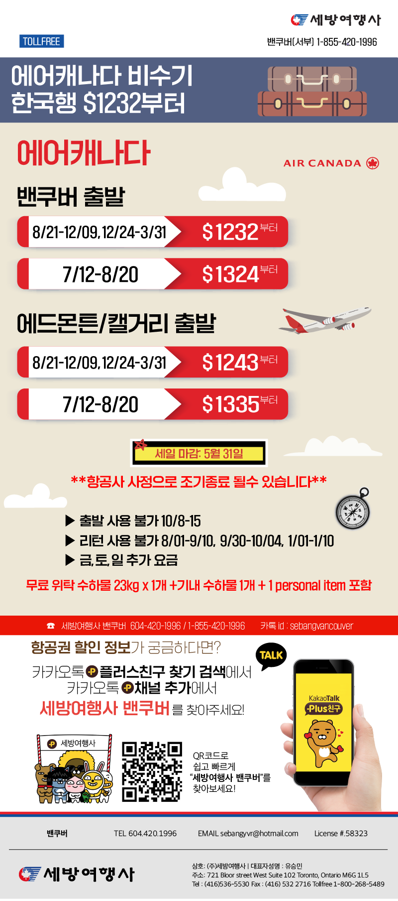 [세방여행레터] 서두르세요!! 온라인 보다 저렴한 에어캐나다 세일은 오늘(9/18 수) 까지2024/09/182024-09-18 19:19:12