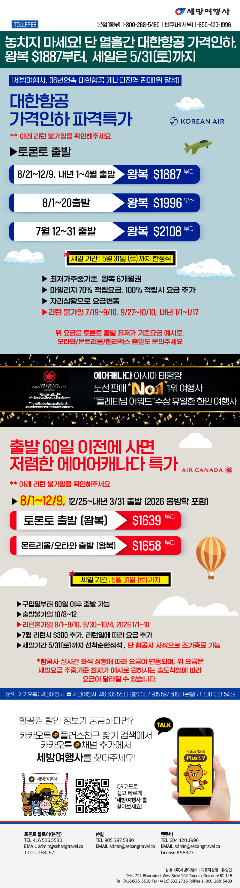 [세방여행레터] 서두르세요! 대한항공/에어캐나다 준성수기 깜짝스페셜! 왕복 $2066부터2024/06/192024-06-19 19:50:42