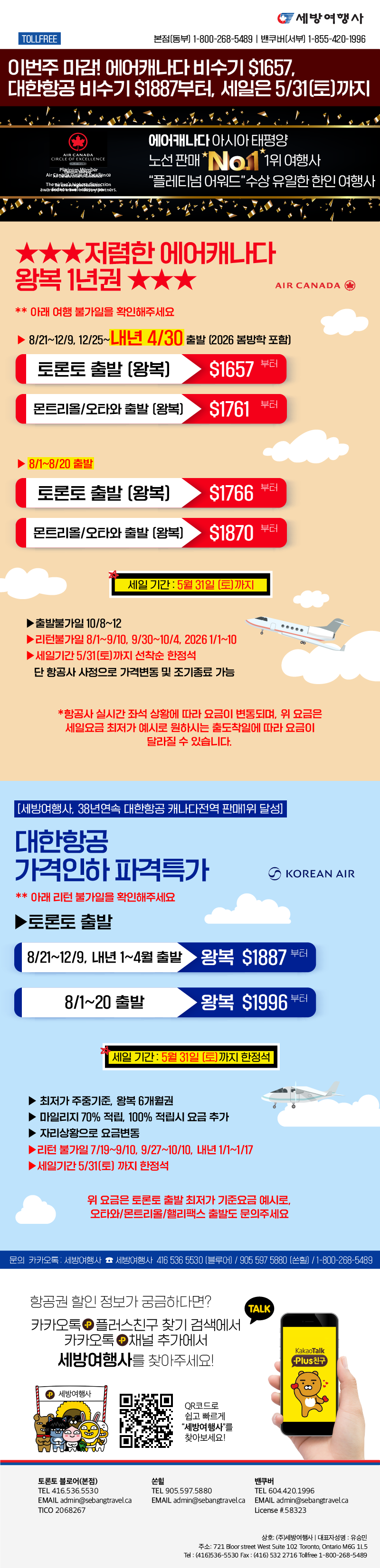 [동부뉴스레터] 이번주 마감! 에어캐나다 비수기 $1657, 대한항공 비수기 $1887부터, 세일은 5/31(토)까지2025/05/262025-05-26 19:21:16