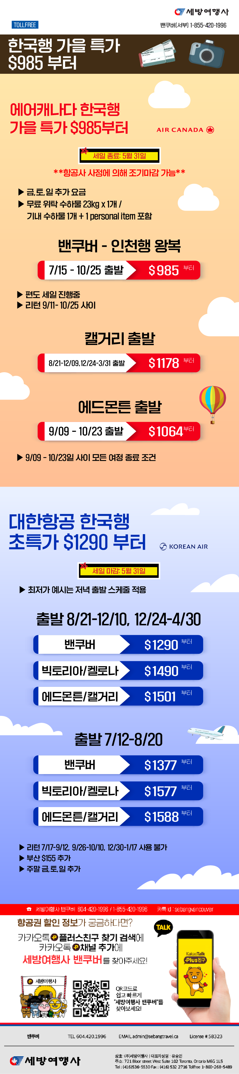 [세방여행레터] 서두르세요!! 온라인 보다 저렴한 에어캐나다 세일은 오늘(9/18 수) 까지2024/09/182024-09-18 19:19:12