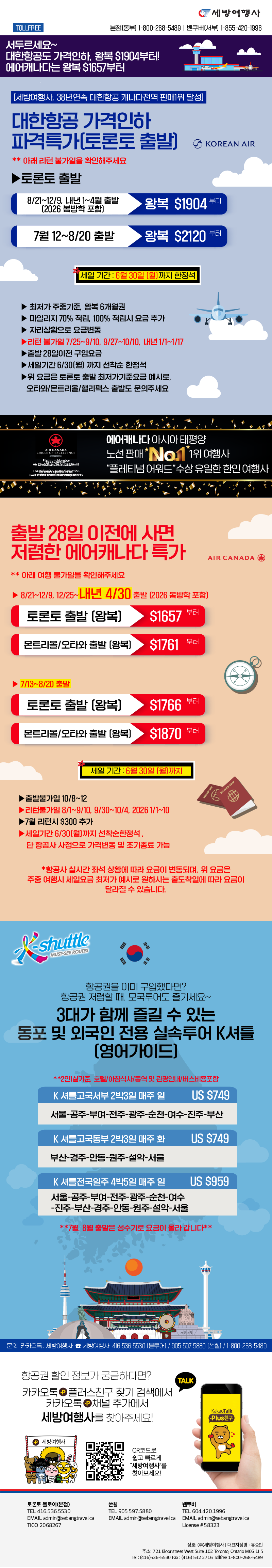 [세방여행레터] 서두르세요! 대한항공/에어캐나다 준성수기 깜짝스페셜! 왕복 $2066부터2024/06/192024-06-19 19:50:42