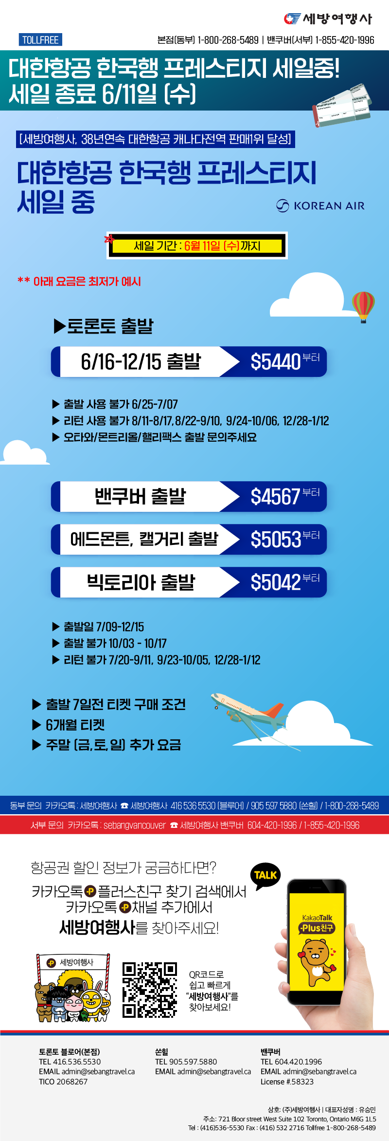[세방여행레터] 대한항공 2024비수기 깜짝세일 6/17(월)까지 연장, 토론토 $1870 밴쿠버 $1654부터2024/06/142024-06-14 14:45:02