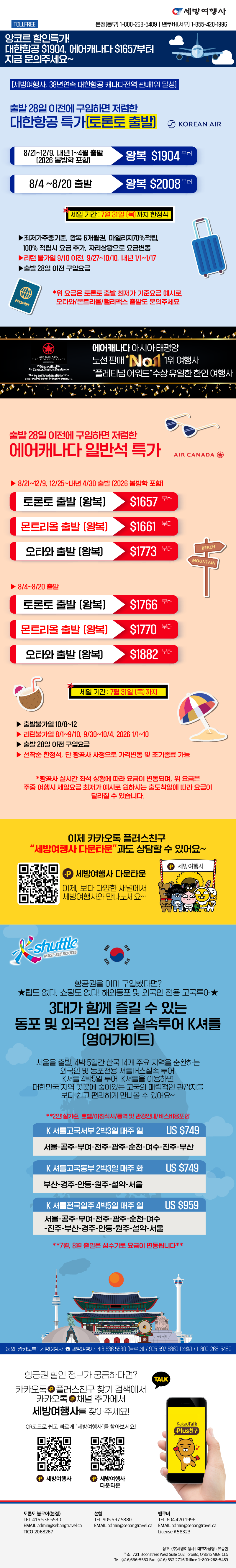 [세방여행레터] 서두르세요! 대한항공/에어캐나다 준성수기 깜짝스페셜! 왕복 $2066부터2024/06/192024-06-19 19:50:42