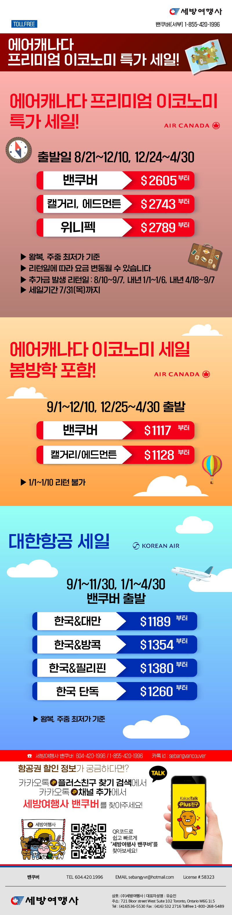 [세방여행레터] 서두르세요!! 온라인 보다 저렴한 에어캐나다 세일은 오늘(9/18 수) 까지2024/09/182024-09-18 19:19:12