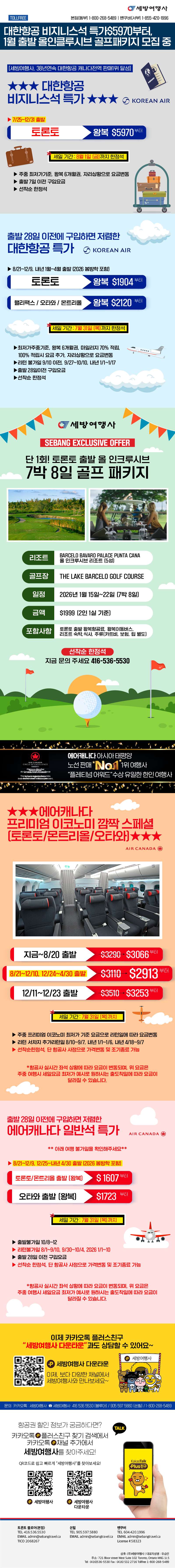 [동부뉴스레터] 마감임박! 세방 단독 토론토 출발 7박8일 골프 패키지 (1월 15일 출발)2025/10/162025-10-16 20:56:01