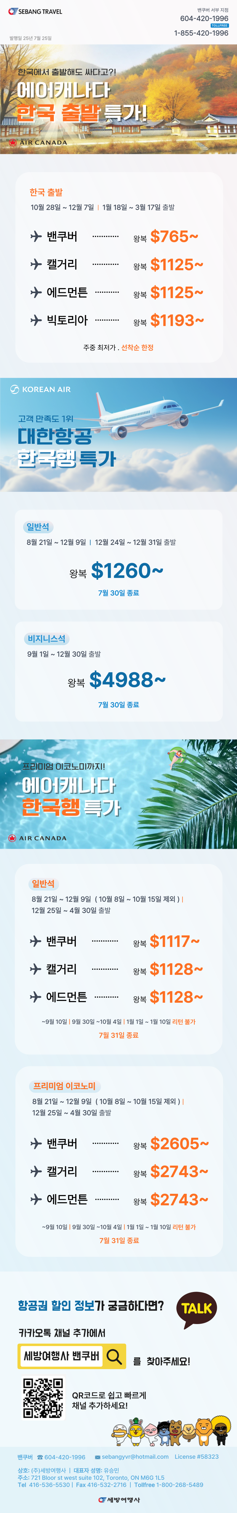 [동부뉴스레터] 여행사만 있는 항공권스페셜, 대한항공 $1807 에어캐나다 $1607 부터 ! 세일은 8월말까지2025/08/272025-08-27 17:12:22