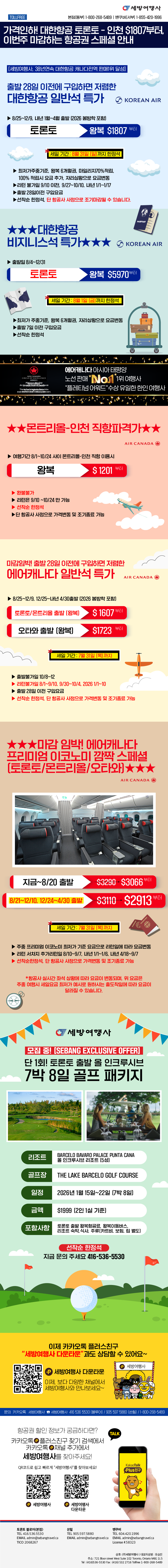 [동부뉴스레터] 여행사만 있는 항공권스페셜, 대한항공 $1807 에어캐나다 $1607 부터 ! 세일은 8월말까지2025/08/272025-08-27 17:12:22