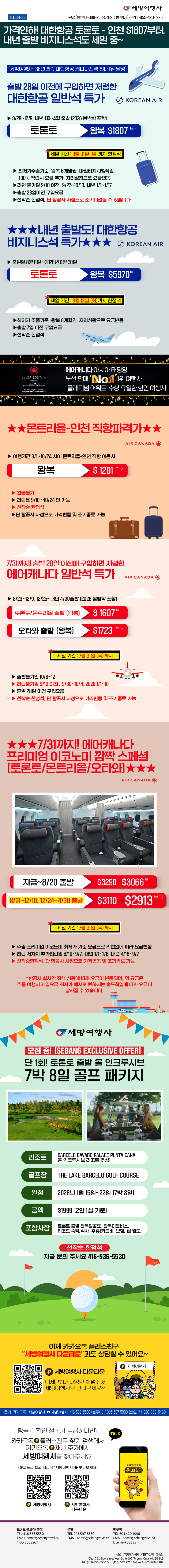 [세방여행레터] 서두르세요! 대한항공/에어캐나다 준성수기 깜짝스페셜! 왕복 $2066부터2024/06/192024-06-19 19:50:42