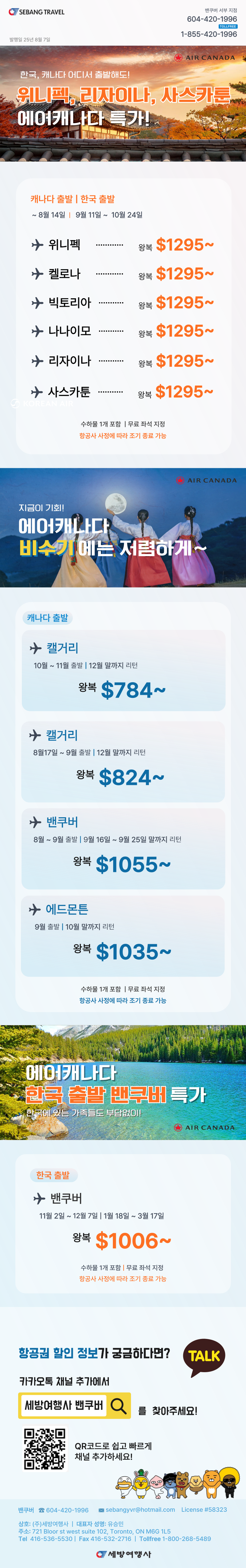 [세방여행레터] 서두르세요!! 온라인 보다 저렴한 에어캐나다 세일은 오늘(9/18 수) 까지2024/09/182024-09-18 19:19:12