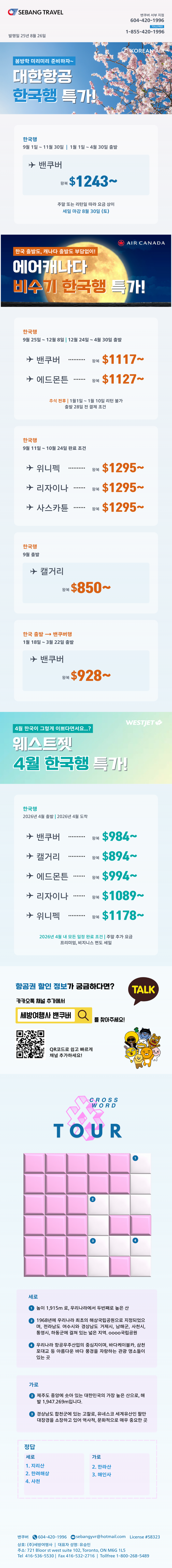 [세방여행레터] 서두르세요!! 온라인 보다 저렴한 에어캐나다 세일은 오늘(9/18 수) 까지2024/09/182024-09-18 19:19:12