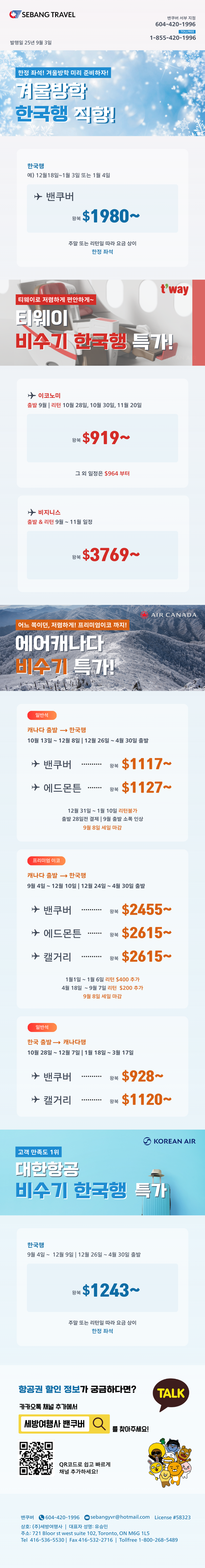 [세방여행레터] 서두르세요!! 온라인 보다 저렴한 에어캐나다 세일은 오늘(9/18 수) 까지2024/09/182024-09-18 19:19:12