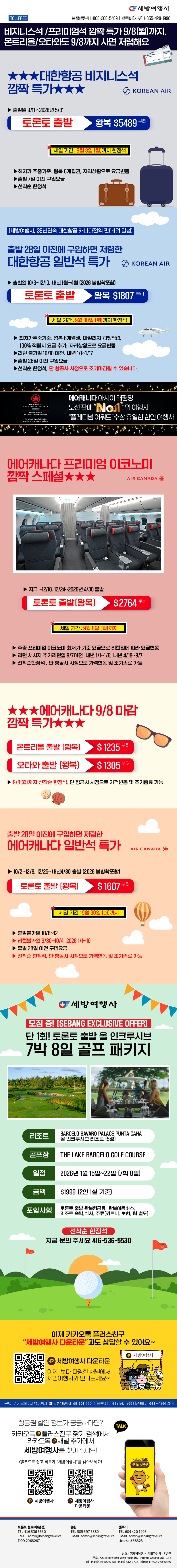 [세방여행레터] 서두르세요!! 온라인 보다 저렴한 에어캐나다 세일은 오늘(9/18 수) 까지2024/09/182024-09-18 19:19:12
