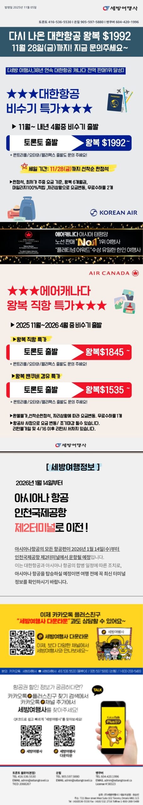 [동부뉴스레터] 가격이 더 내렸어요~ 대한항공 비수기 왕복 $1992부터, 에어캐나다는 $1845부터2025/10/152025-10-15 20:32:41