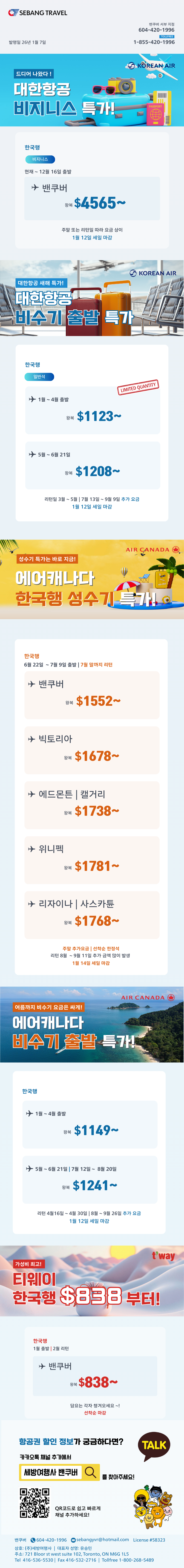 | [서부뉴스레터] 한국행 특가 밴쿠버 $1175부터~ 에드먼튼/캘거리 출발 $904부터~ | 2025/12/19 | 2025-12-19 21:11:07 |