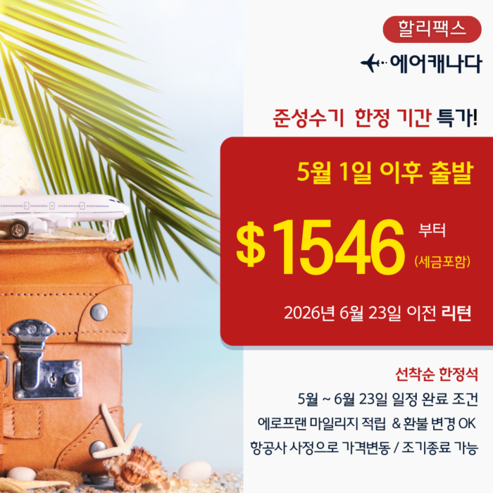 **핼리팩스 출발 주중 최저가 기준 예시요금으로 ,원하시는 출도착일에 따라 요금이 달라질수있습니다.