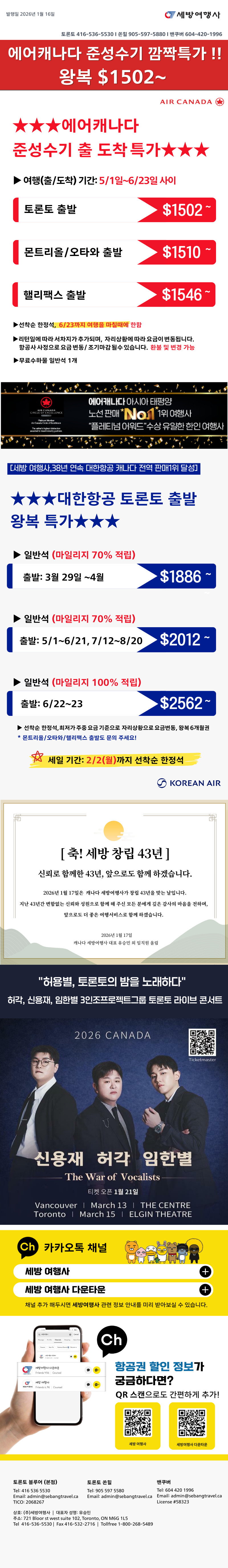 [동부 뉴스레터] 에어캐나다 준성수기 깜짝특가 왕복 $1502~2026/01/162026-01-16 20:51:49