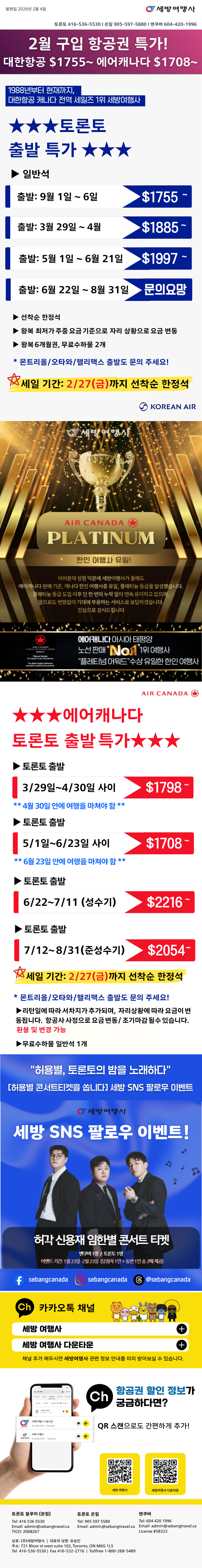 | [동부뉴스레터] 에어캐나다 시즌파괴! 출발 60/ 90/120일 전에 구입하는 미리미리특가, 토론토출발왕복 $1334부터 | 2025/02/12 | 2025-02-12 18:08:21 |