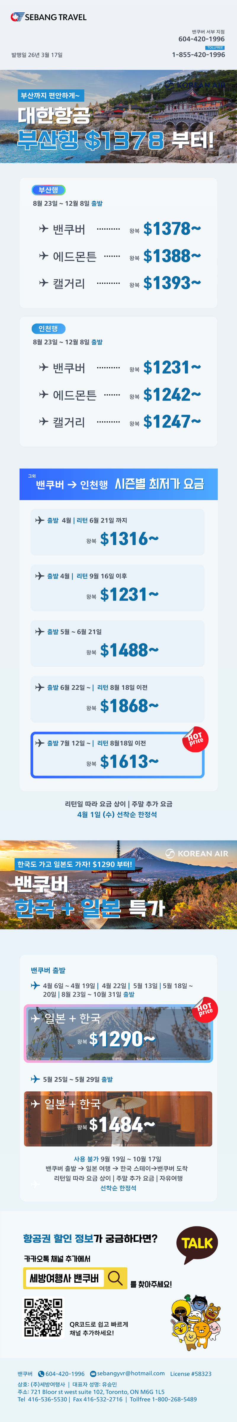 | 에어캐나다 $300 OFF 오늘까지, 대한항공 기종변경 비지니스석 /일반석스페셜 왕복$2023 부터 | 2024/08/23 | 2024-08-23 14:58:15 |